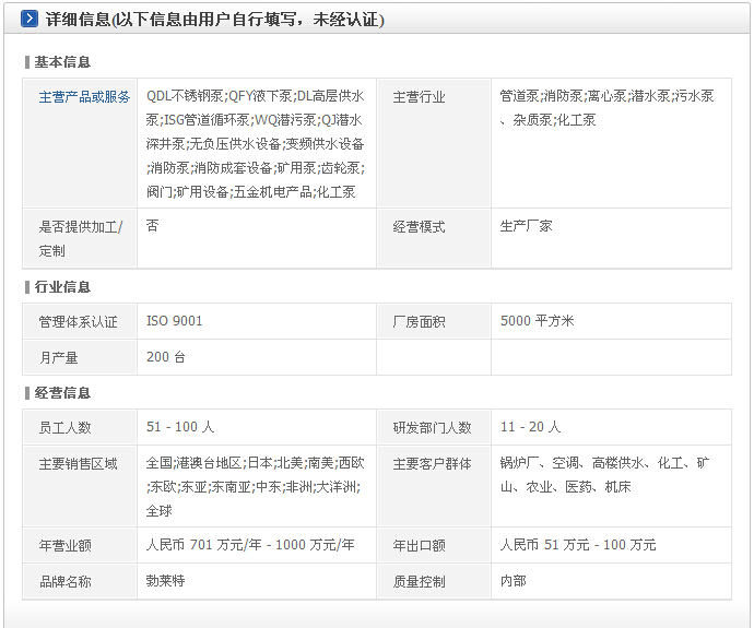 公司主要產品有QDL系列、DL系列多級離心泵、ISG、ISR、ISF系列管道式單級立式離心泵、QJ系列潛水泵、QFY系列節能輕型系列不銹鋼機床液下泵、WQ系列潛水排污泵等十幾大品種系列,兩千余種優質特種水泵。部分產品的葉輪及導流部件均采用不銹鋼沖壓、拉伸自動焊接成型等先進技術及工藝,具有體積小、重量輕、效率高等特點,被國家節能委評為全國優秀節能產品,并順利通過國家船級社的產品認證,國家消防產品認證。產品廣泛用于鍋爐配套、高層建筑供水、醫療機械、食品釀造、船舶、機床、輕工、化工、消防等行業及工農業供排水等,暢銷全國并批量出口歐、美、亞、非等國家和地區。公司本著“誠信、創新、卓越”的經營理念深受廣大用戶的信賴,羸得廣泛的信譽度與美譽度。