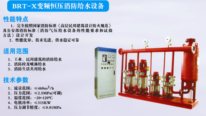 | 隨著二次供水加壓技術的發(fā)展,供水設備從根本上解決了水塔供水的問題。據“供水設備推廣中心”的資料顯示,供水設備不需建造水塔,投資小、占地少,采用水氣自動調節(jié)、自動運轉、節(jié)能與自來水自動并網,停電后仍可供水,調試后數年不需看管。比建造水塔節(jié)約投資70%,比建造高位水箱節(jié)約投資60%,大大節(jié)約土建投資。 | 設備投入運行后,當出現火情,管網壓力下降至消防主泵的啟動壓力點時,主泵自動啟動,如果主泵仍不能滿足消防用水量,則管網壓力會持續(xù)下降,降至備用泵啟動壓力點時,備用泵立即啟動投入運行。 |