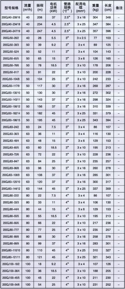 QJ型井用潛水電泵是從深井中提取地下水的成套機具,廣泛應用于農田灌溉、工礦企業的供排水及高原、山區的人畜用水。QJR型井用熱水潛水電泵,采用特殊材質和結構,用于提取地下熱水。 另外本公司根據用戶需要生產海水、礦山等特殊場合用潛水電泵。該泵主機由QJ型潛水泵和YQS型潛水電機組成。潛入水下工作,具有結構緊湊、體積小、重量輕,安裝、使用、維護方便,運輸安全可靠、節約能源等優點。